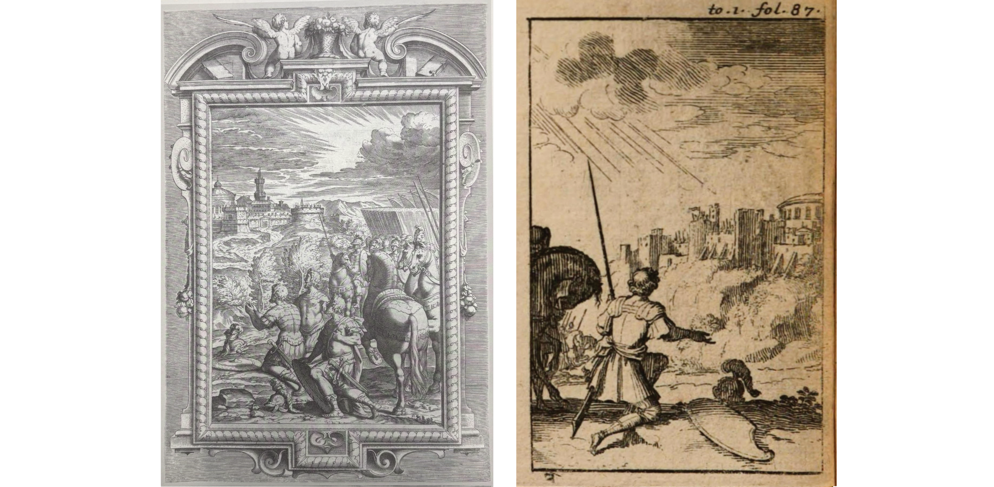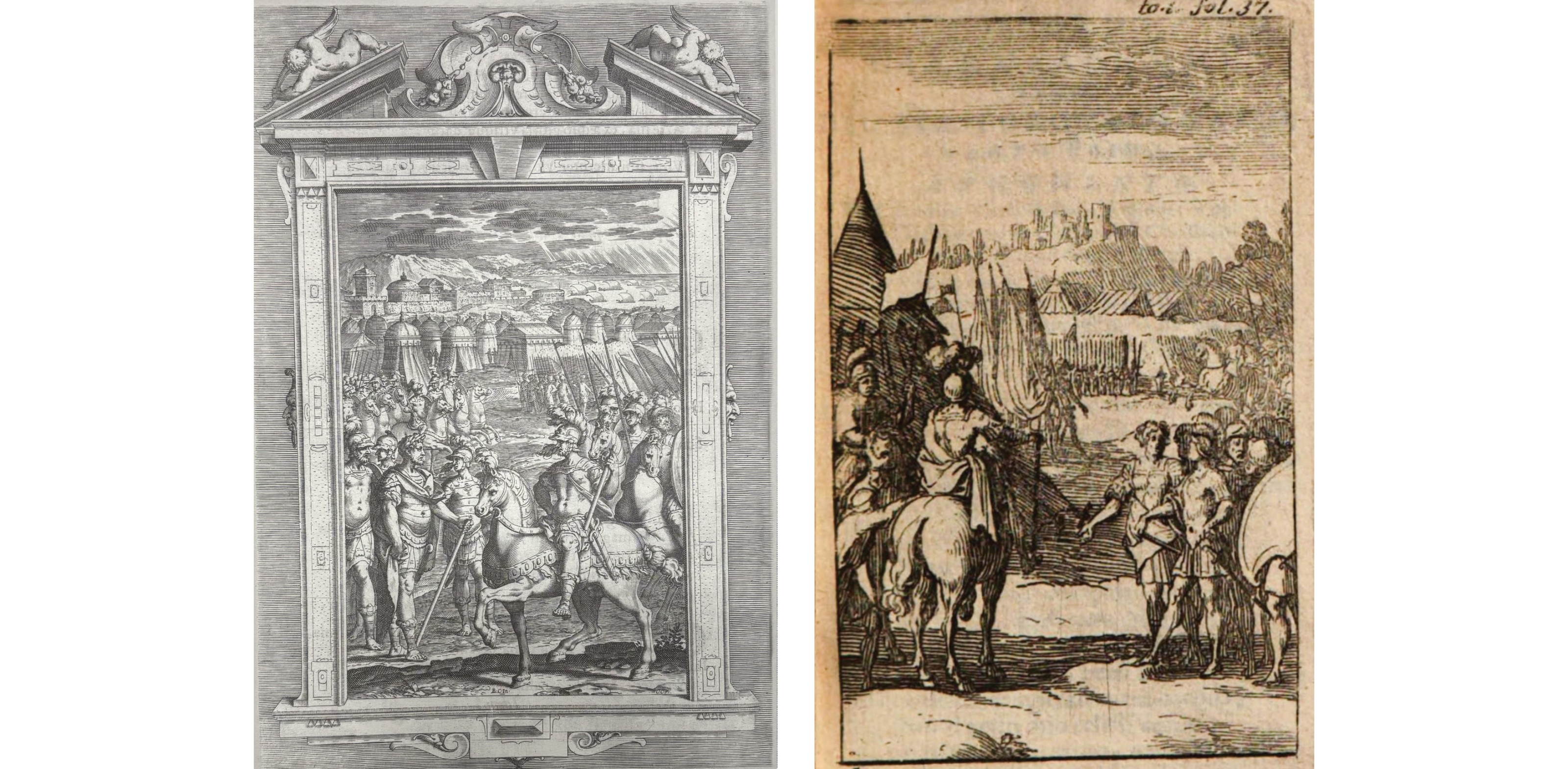 L’eliminazione o la semplificazione della scena in secondo piano proposta dal modello del Castello da parte dell’illustratore francese comporta un’altra conseguenza. Nelle figure di Castello, sin dalla redazione ‘A’ (Osanna 1584; Bartoli 1590), Gerusalemme rivestiva un ruolo centrale e nell’edizione in folio Pavoni 1617: la rappresentazione della città era ben definita. E sebbene il più delle volte sia conservato il particolare di un imponente edificio circolare coperto da una cupola, in cui forse Castello aveva sintetizzato il gran Sepolcro e il Tempio di Salomone (Benassi 2017), la perizia architettonica di Leclerc non emerge quasi mai nell’operazione editoriale di Elsevier-Jolly, non solo nella Liberata ma anche nelle altre opere, tanto per il ristretto formato quanto per il registro meno elevato che il formato ristretto finiva per imporre.