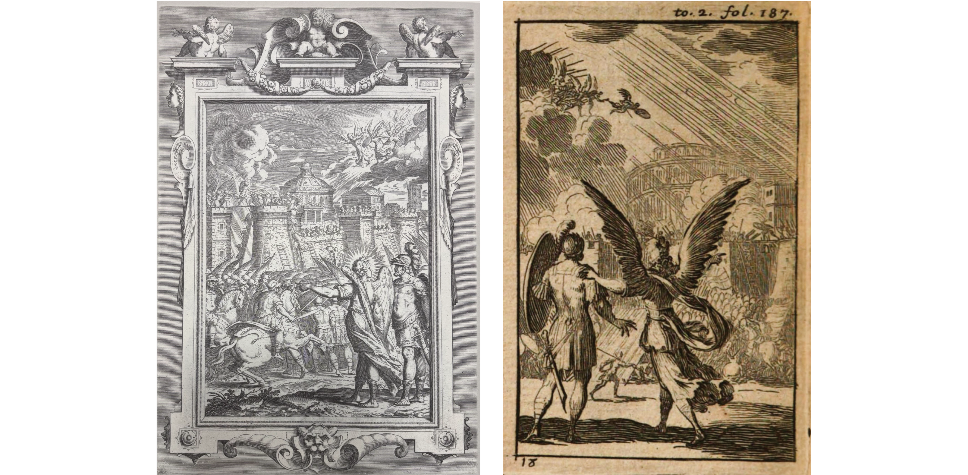 Ma torniamo al nostro Leclerc. Come di consueto, l’illustratore francese propone nuovamente la scelta della redazione ‘C’ del Castello (Pavoni 1617) per il canto XVIII, con l’arcangelo Michele, visibile al solo Goffredo, che gli intima di drizzar gli occhi “a riguard l’immenso / essercito immortal ch’è in aria accolto” (Lib. XVIII, 93, 1-2) mentre sotto infuria lo scontro [Fig. 23]. Stavolta Leclerc, ben conscio del minor spazio a disposizione, opta per semplificare la scena, riducendo di molto la rappresentazione della battaglia, ormai piuttosto indistinta, e della città, sintetizzata quasi in un unico edificio circolare [Fig. 24]. Oltre a ciò, applica nuovamente lo stesso espediente già considerato per il canto III, presentando il capitano e l’angelo completamente di spalle, anziché di profilo come nel modello, permettendo nuovamente al lettore di sovrapporre perfettamente il suo sguardo a quello di Goffredo dinnanzi alla “milizia innumerabile ed alata” (Lib. XVIII, 96, 34).