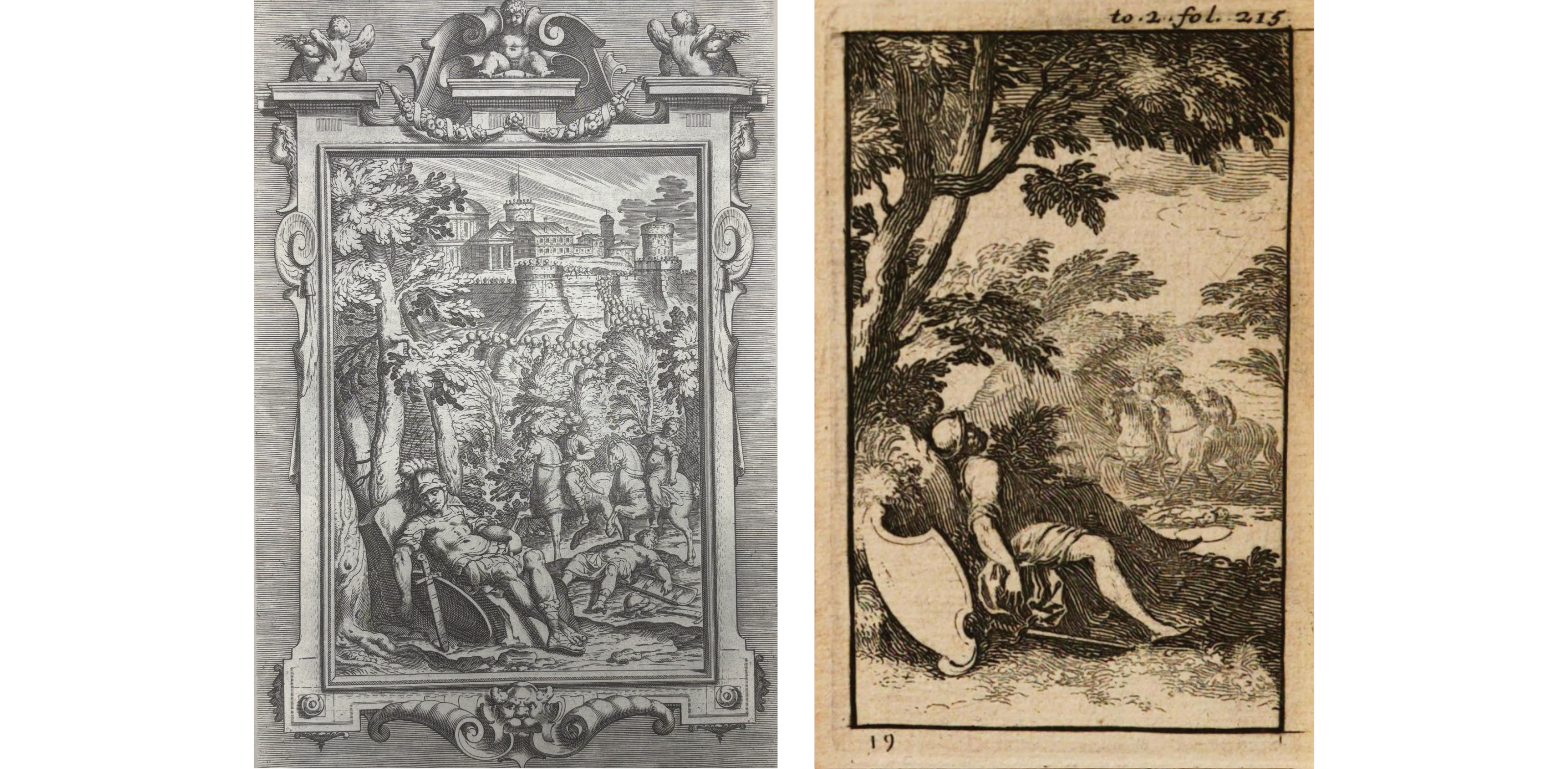 Che il canto III e il canto XIII della Gerusalemme propongano schemi iconografici simili è un dato evidente e non è insolito ritrovare nella tradizione illustrata dittici di incisioni simili tra loro. Nel caso delle incisioni di Leclerc, l’edizione veneziana per Domenico Lovisa (1685) scambia per esempio le due illustrazioni esaminate, proponendo erroneamente il cavaliere del canto XIII per il canto III e, viceversa, il crociato del III per quello del XIII. Anche qualora la scelta figurativa sia ricaduta altrove, non si è esente da errori: uno dei dittici più diffusi è la rappresentazione di Tancredi nella selva per il canto XIII e di Rinaldo nella medesima foresta per il canto XVIII. Prendiamo in esame la prima edizione che propone questa ‘coppia’, con il solito Castello stavolta però nella versione del 1604 (Pavoni 1604), replicata nell’edizione Sforzini 1618 e dunque, nel supposto Leclerc del 1674 per l’Hercole: ci sembra innegabile che in quest’occasione le due illustrazioni siano state scambiate in sede di stampa, a partire dall’edizione Pavoni 1604 e perpetuando l’errore nelle successive del 1618 e del 1674. Almeno un paio di elementi suffragano questa ipotesi: in primis, osservando le piante opposte ai cavalieri, è evidente che quello nell’edizione Pavoni 1604 al canto XIII è un cipresso [Fig. 19], mentre quello per il canto XVIII è più simile al mirto [Fig. 20]. Come è noto, è Tancredi a trovarsi davanti al cipresso (Lib. XIII, 38) – pianta funeraria per eccellenza – mentre a Rinaldo si palesa un mirto (Lib. XVIII, 25); se poi si raffronta l’apparizione rispettivamente della falsa Clorinda e della falsa Armida, è chiaro che quest’ultima corrisponde alla nostra figura 19, quando di fronte a Rinaldo che “stringe il ferro ignudo” (Lib. XVIII, 33, 8) ella “vassene al mirto; allor colei s’abbraccia / al caro tronco, e s’interpone e grida” (Lib. XVIII, 34, 1-2); inoltre, mentre ‘Clorinda’ compare da sola agli occhi di Tancredi [Fig. 20], dinanzi a Rinaldo, prima ancora dell’apparizione di ‘Armida’, spuntano “insieme poi cento altre piante / cento nife produr dal seno pregnante” (Lib. XVIII, 26), ed è nella sola figura 19 che compare più di una persona tra le piante. La confusione non si crea invece nell’edizione Andreoli 1670 – le cui illustrazioni di Clouwet vengono riprese nell’edizione Quartaroli 1678 – perché qui, a fronte di un Rinaldo che continua ad alzare la spada verso l’albero antropomorfo per il canto XVIII, per il canto XIII si sceglie di rappresentare la pioggia finalmente inviata da Dio che rinnova le speranze dei crociati, raffigurati proprio come descritti da Tasso: