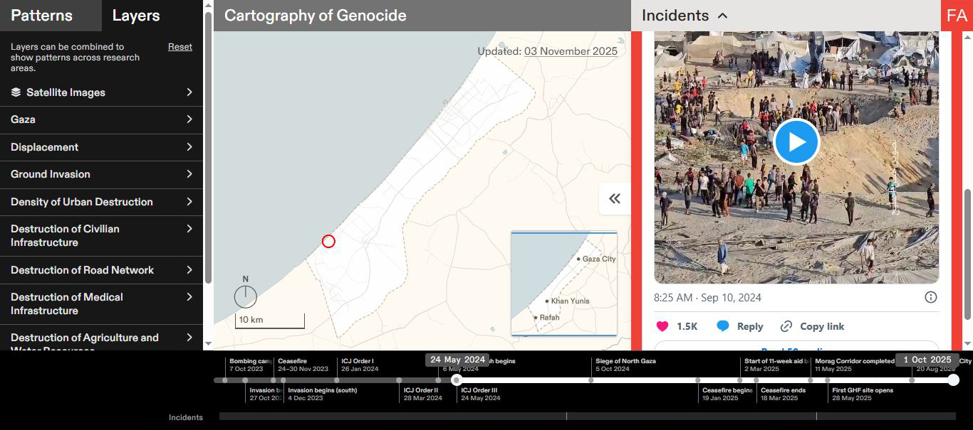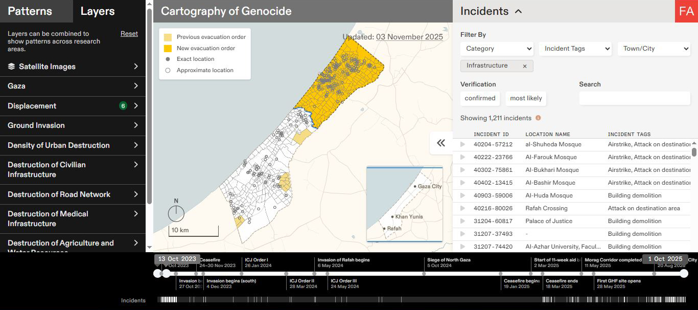 A Cartography of Genocide is Forensic Architecture’s spatial investigation of systematic violence in Gaza. Produced by the London-based agency founded by architect Eyal Weizman, the project integrates open-source imagery, testimonies, and geospatial analysis to map the relational structure of destruction beyond individual incidents. Researcher Davide Piscitelli discusses counterforensic methodologies that reconstruct intentionality, challenge state narratives, and produce actionable evidence for legal and human-rights contexts. The platform thus functions as a critical epistemic tool for documenting genocide through correlations in space and time.