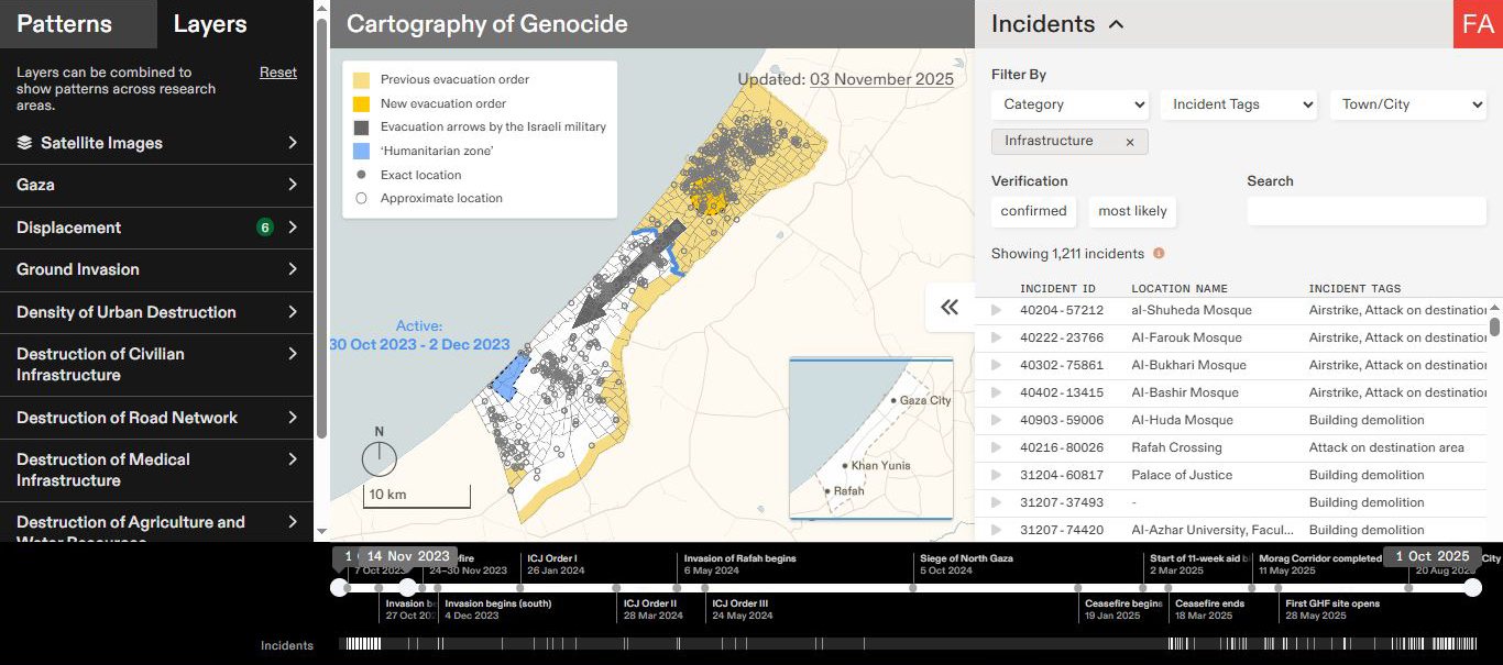 È imperativo e urgente tenere traccia, in termini conoscitivi e politici, dell’insieme di atti, decisioni, distruzioni che compongono un genocidio. È in questo orizzonte che si colloca il progetto A Cartography of Genocide realizzato dal collettivo londinese Forensic Architecture. Il gruppo prende sul serio la sfida dell’iperproduzione di immagini e informazioni, cercando di costruire un contro-dispositivo: una pratica investigativa e cartografica capace di dare forma, nel tempo e nello spazio, a ciò che altrimenti verrebbe disperso nella cronaca accelerata della violenza.