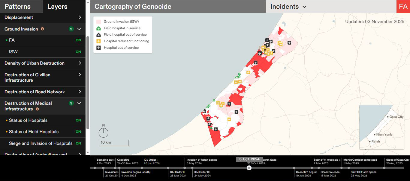 10 | Relazione tra l’occupazione territoriale da parte dei militari israeliani e il livello di operatività degli ospedali a Gaza dati al 5 ottobre 2024 (Forensic Architecture, A Cartography of Genocide: Israel’s Conduct in Gaza Since October 2023, 2025).