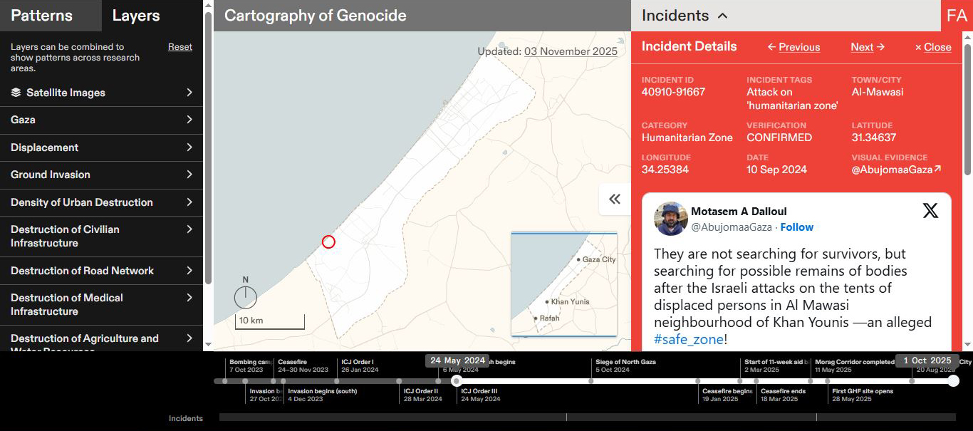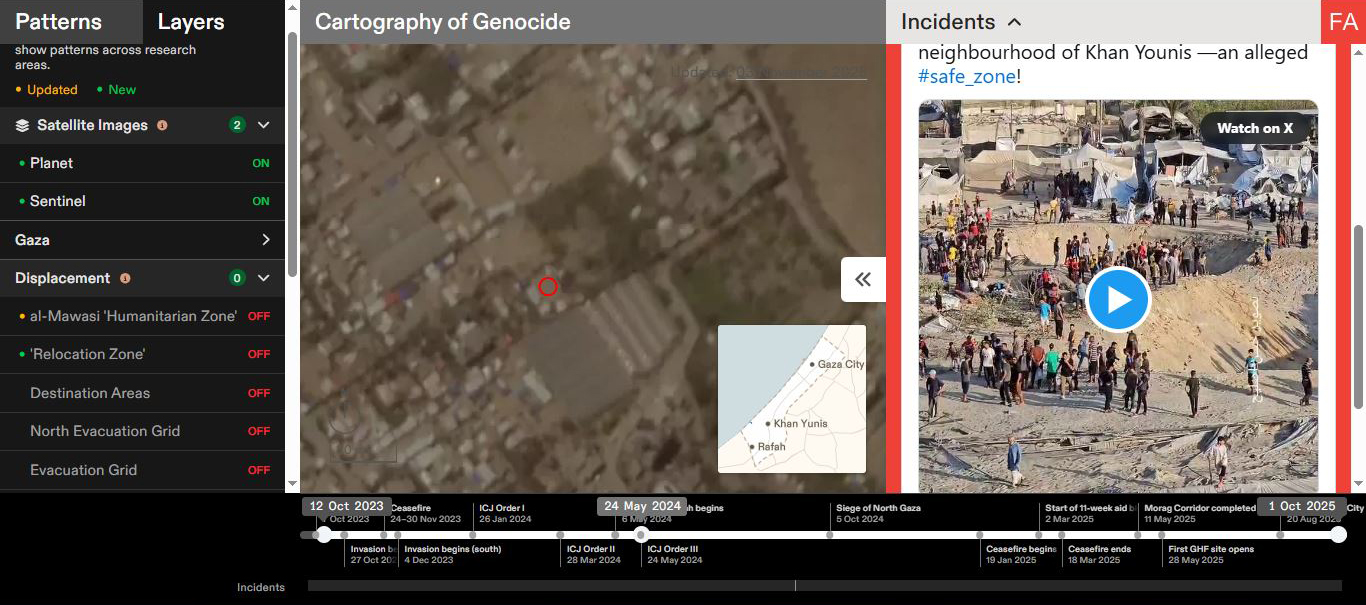 3 | Geolocalizzazione di un video utilizzato come prova visiva inserito nella piattaforma. Attacco del 24 maggio 2024 ad Al-Mawasi (Forensic Architecture, A Cartography of Genocide: Israel’s Conduct in Gaza Since October 2023, 2025).