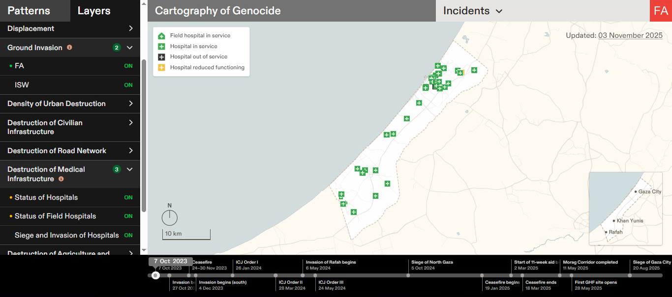 In questa prospettiva, la cartografia diventa lo strumento per tessere le relazioni tra gli episodi e contrastare l’anestesia percettiva prodotta dall’abbondanza di immagini. Ogni ospedale reso inservibile, ogni infrastruttura distrutta, ogni casa cancellata dal suolo appaiono sulla mappa come un nodo di una rete attentamente progettata per rendere invivibile e infine espellere la popolazione palestinese. Un dispositivo nato storicamente come strumento coloniale di controllo territoriale viene così contro-utilizzato: la cartografia, in questo caso, non è più tecnica di dominio, ma tentativo di dare forma a ciò che appare invisibile e indicibile, rendendo il genocidio descrivibile, argomentabile e opponibile sul piano politico e giuridico.