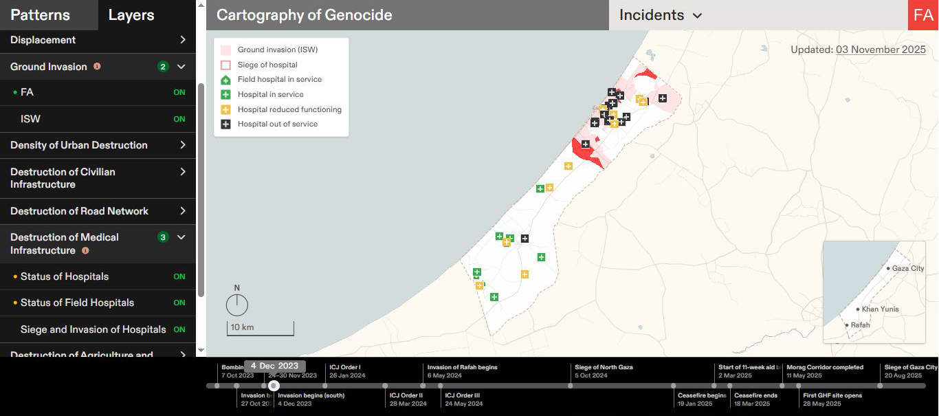 8 | Relazione tra l’occupazione territoriale da parte dei militari israeliani e il livello di operatività degli ospedali a Gaza dati al 4 dicembre 2023, (Forensic Architecture, A Cartography of Genocide: Israel’s Conduct in Gaza Since October 2023, 2025).