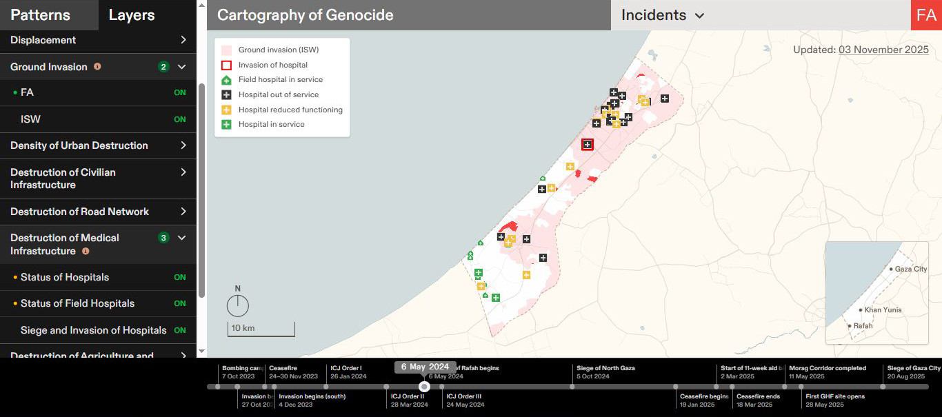 9 | Relazione tra l’occupazione territoriale da parte dei militari israeliani e il livello di operatività degli ospedali a Gaza dati al 6 maggio 2024 (Forensic Architecture, A Cartography of Genocide: Israel’s Conduct in Gaza Since October 2023, 2025).