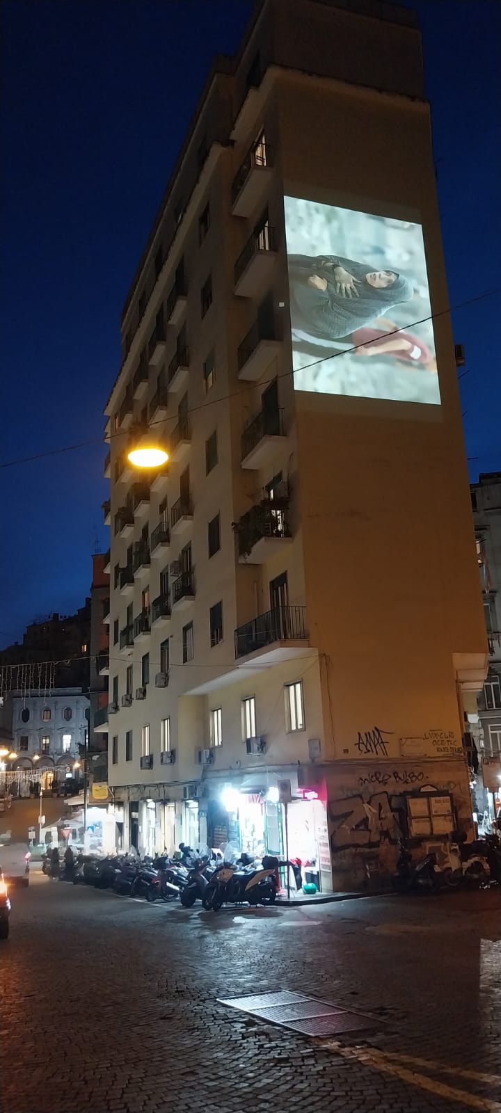 Proiezione da Palazzo Degas, Calata Trinità Maggiore, di Qui resteremo, a cura dell’archivio Gaza_Fuorifuoco_Palestina, Napoli, 29 novembre-2 dicembre 2025.