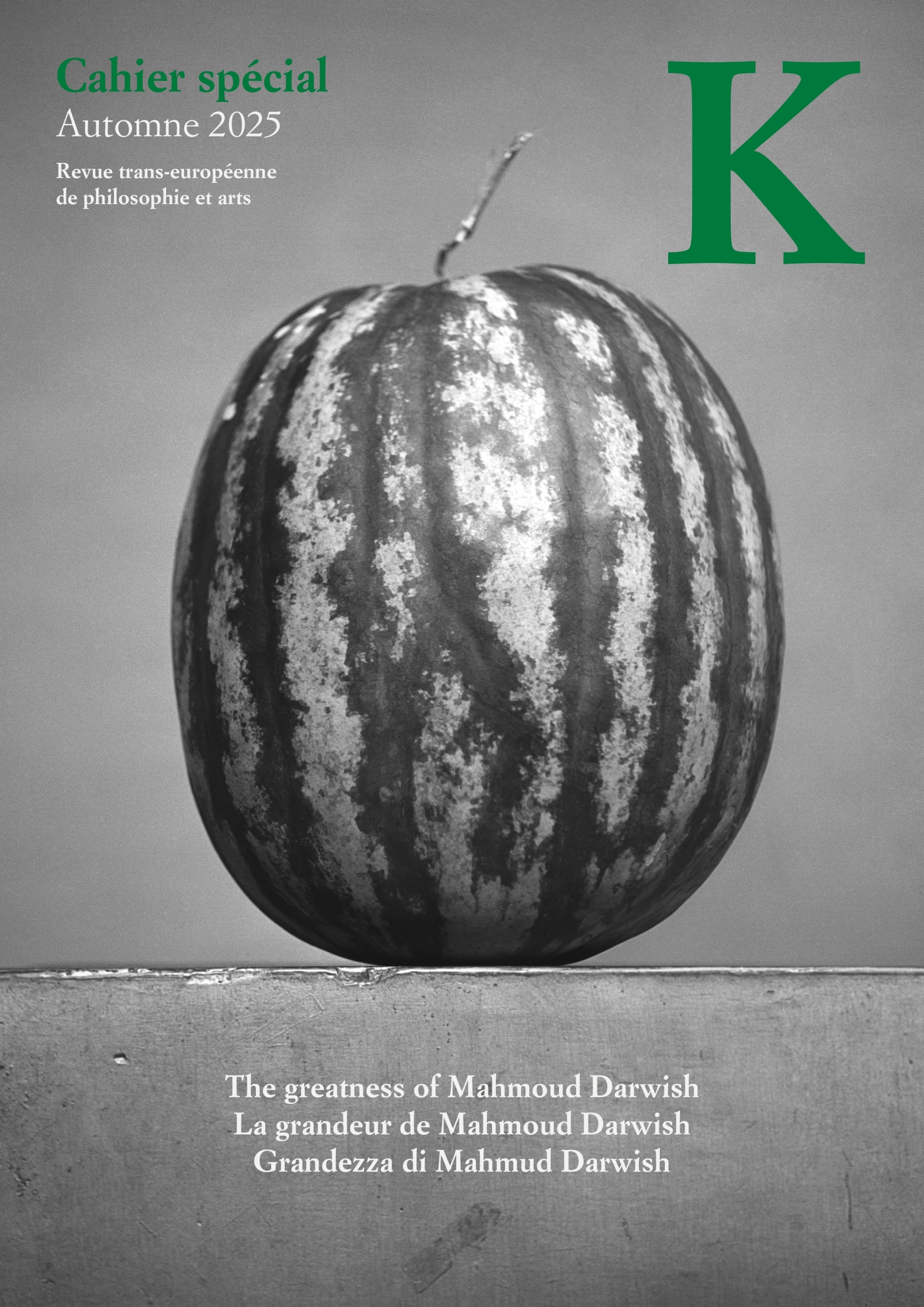 L’ultimo numero speciale di “K” appare nel settembre 2025: Grandezza di Mahmoud Darwish, dedicato al genocidio del popolo palestinese, quindi, in particolare, alla sparizione di Gaza, e che fa eco all’indimenticabile testo Grandezza di Yasser Arafat (1983), scritto da Gilles Deleuze a un anno dal massacro avvenuto nei campi-profughi palestinesi di Sabra e Chatila, in Libano.