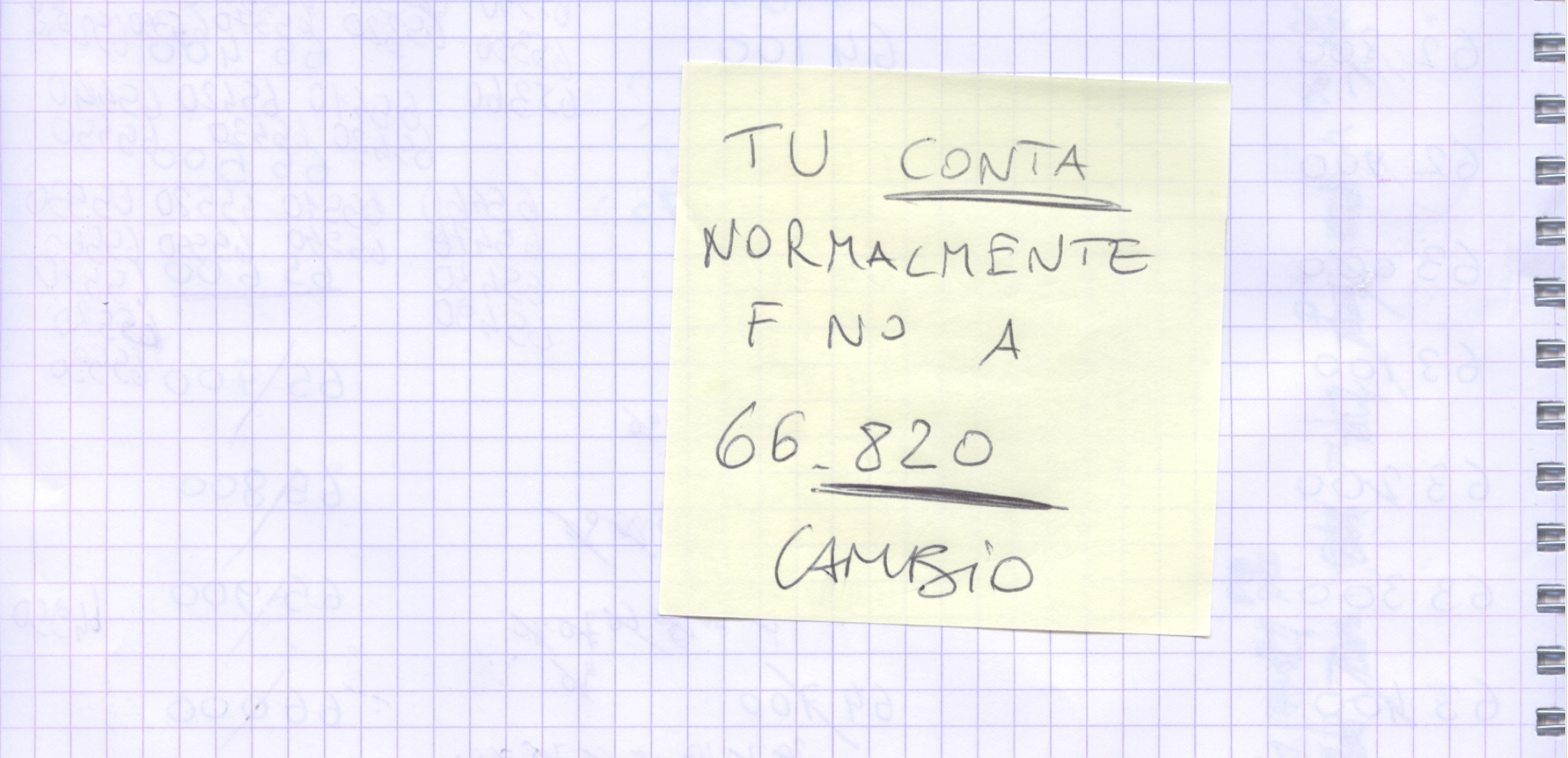 L’azione è stata realizzata nel mio studio di Viale Trastevere 259 a Roma, a partire dalla mezzanotte del primo novembre e si è conclusa alle 22.35 del 3 novembre, dopo 46 ore e mezzo di conteggio ininterrotto. Numerose persone hanno risposto al mio invito a collaborare a questo progetto. Dandosi il cambio a contare all’incirca ogni 30 minuti, sono intervenute: Gloria Fraternale, Christian Fecchi, Michele Miranda, Angela Mara Piga, Helia Hamadani, Martina Merico, Aurora Vivenzio, Pasquale Polidori, Anna Gloria Flores, Luca Valerio, Noemi Saltalamacchia, Sergio Sarra, Francesca Pinton, Luisa De Donato, Ilaria Mancia, Alex Paniz, Manuel Grillo, Costanza Mancuso, Giacomo Raffaeli, Matteo Nasini, Enrica Palmieri, Giorgia Borgogno, Giulia Pistoso, Emily Jacir, Federico Ferrari, Agnieszka Gratza, Giorgia Accorsi, Caterina Borelli, Benedetta Cestelli Guidi, Sara Alberani, Marta Cornacchia, Marta Dell'Angelo, Chiara Boitani.