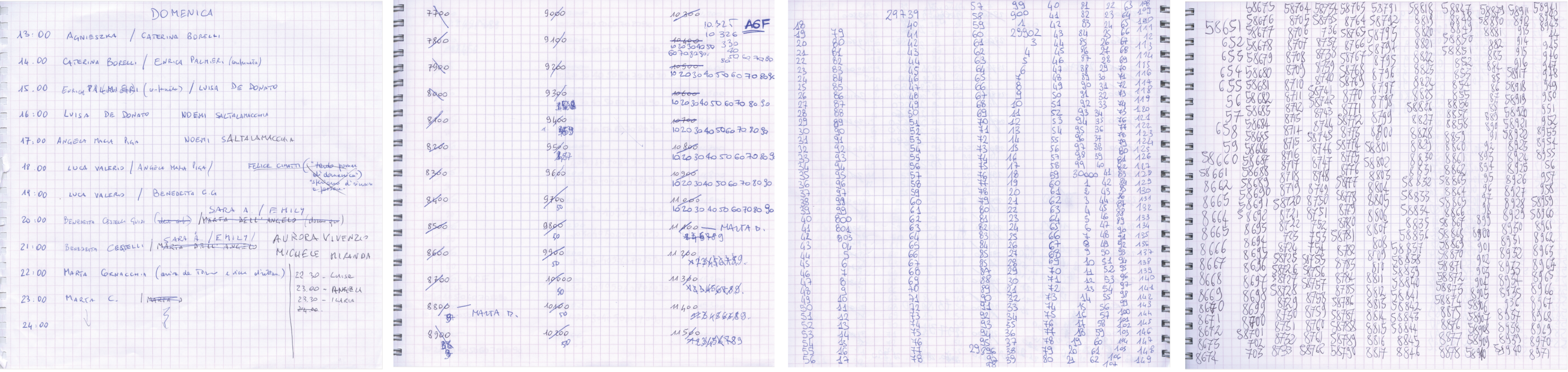 In maniera simile, il quaderno su cui molti dei partecipanti hanno segnato per iscritto il numero a cui man mano arrivavano – a volte andando di cento in cento, a volte segnandoli a uno a uno – è indice della stessa incertezza per la quale ci si rivolge alla tecnica della scrittura per superare la paura di sbagliare la sequenza verbale. Queste pagine, ora scarabocchiate disordinatamente, ora compilate con meticolosità ossessiva, raccontano anch’esse una forma di resistenza che fa quasi tenerezza, rispetto alla inflessibile esattezza dell’ordine numerico.