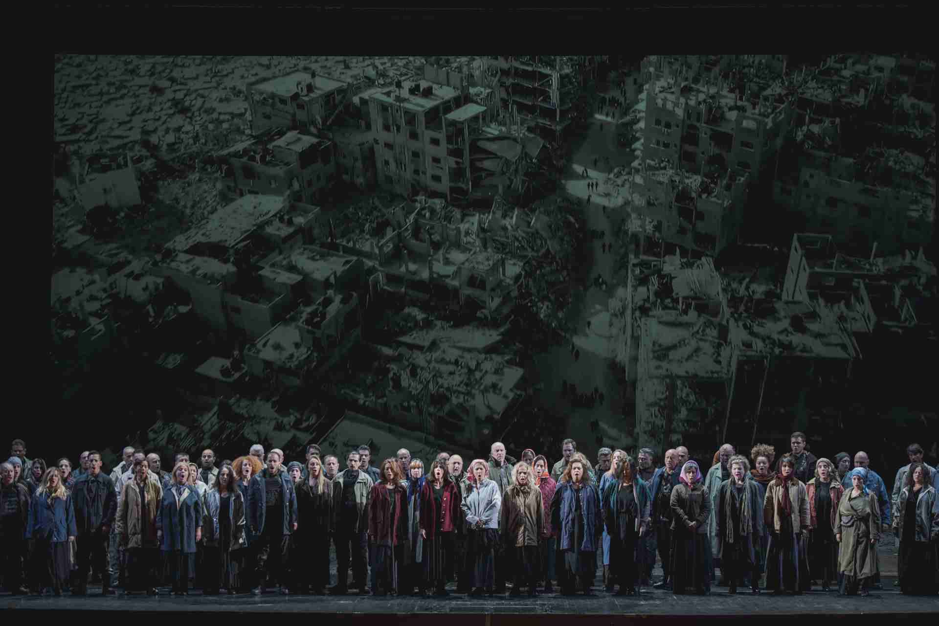 Per quanto riguarda le immagini, ho scelto quelle che tutti ormai conosciamo: immagini riprese dall’alto, spesso attraverso droni. Sono immagini che appartengono alla grammatica della guerra contemporanea da diversi decenni. La prima volta che abbiamo visto immagini di questo tipo è stata durante la guerra in Iraq: ricorderete quelle riprese notturne, con i sensori, tutte virate sul verde. Non erano ancora quelle dei droni, ma immagini quasi astratte, in cui improvvisamente l’essere umano colpito dagli ordigni veniva ridotto, minimizzato fino quasi a scomparire. A volte restava solo un insieme di pixel sgranati. Questa modalità di rappresentazione è continuata nel tempo e oggi, con l’uso dei droni, produce immagini dall’alto in cui vediamo le macerie, ma raramente le persone. Se guardate l’immagine del coro, a un certo punto la scena è dominata da queste riprese lontanissime dall’alto, mentre il coro entra uno a uno. Ho voluto una entrata del coro lunghissima: uomini e donne che attraversano il palcoscenico da destra a sinistra e si dispongono sotto l’immagine.