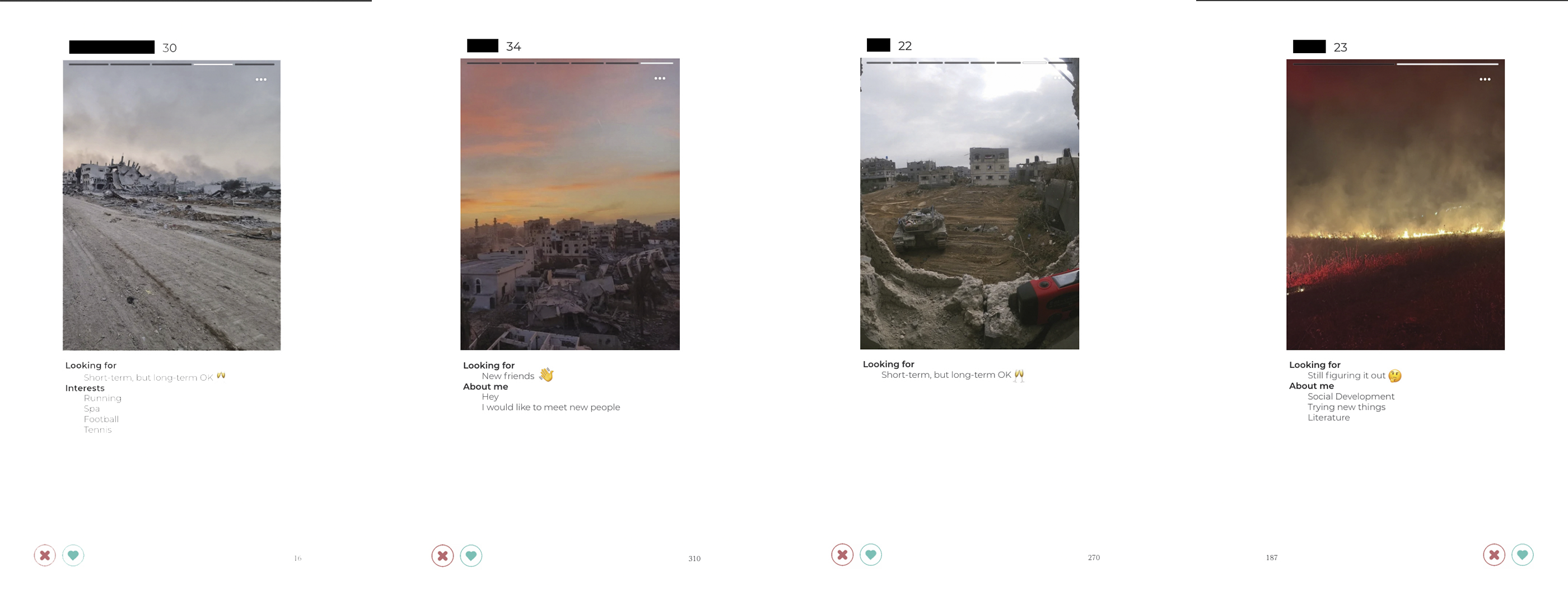 C’è chi si identifica attraverso romantici tramonti su paesaggi svuotati. C’è chi si identifica esclusivamente con la distruzione – nessun soggetto, fotografie vuote, macerie, apocalisse. È così che scelgono di rappresentarsi i soldati dell’Idf su Tinder. A raccoglierne una selezione è il fotografo Federico Vespignani, che in un periodo di ricerca compreso tra maggio e settembre 2024, ha censito la presenza di almeno tremila profili riconducibili a militari geolocalizzati nell’area della Striscia di Gaza – quasi un terzo di circa diecimila soldati schierati da Israele – archiviandoli sotto forma di screenshot e pubblicandoli in forma di un progetto e di un volume dal titolo Short term, but long term. A rendere il materiale raccolto da Vespignani particolarmente perturbante è la destinazione per la quale questo è originariamente pensato: Tinder, popolare app di incontri, utilizzata per l’esposizione del sé e per la ricerca, erotica e/o sentimentale, di un partner attraverso qualche fotografia e poche righe di testo.
