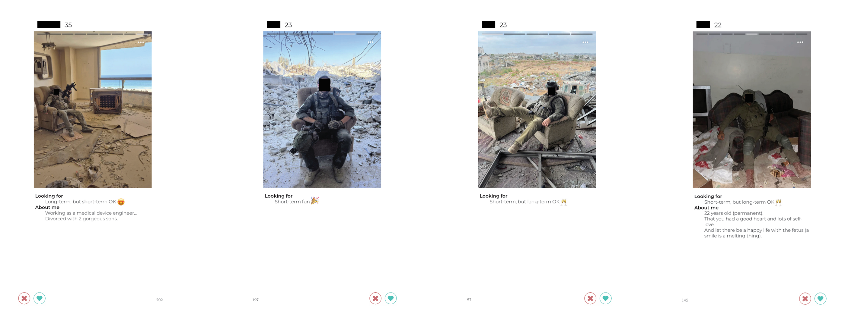 Soldati seduti, in posa composta e tronfia, oppure stravaccati sui divani delle case profanate dei gazawi: case bombardate, bucate, penetrate, spogliate, ribaltate. Le poltrone diventano troni usurpati, i letti e i sofà sono i talami violati, dissacrati. Gli spazi domestici devastati sono convertiti in assurdi teatri di morte. È un capitolo diverso ma parallelo della pratica della profanazione che caratterizza ogni conflitto, resa esplicita dal tristemente noto caso delle fotografie pubblicate sui social dagli stessi soldati israeliani con indosso biancheria intima femminile. Sono i soldati israeliani che rappresentano trionfalmente se stessi in atti di dominio, tutte funzioni della messa in scena di trofei di guerra.