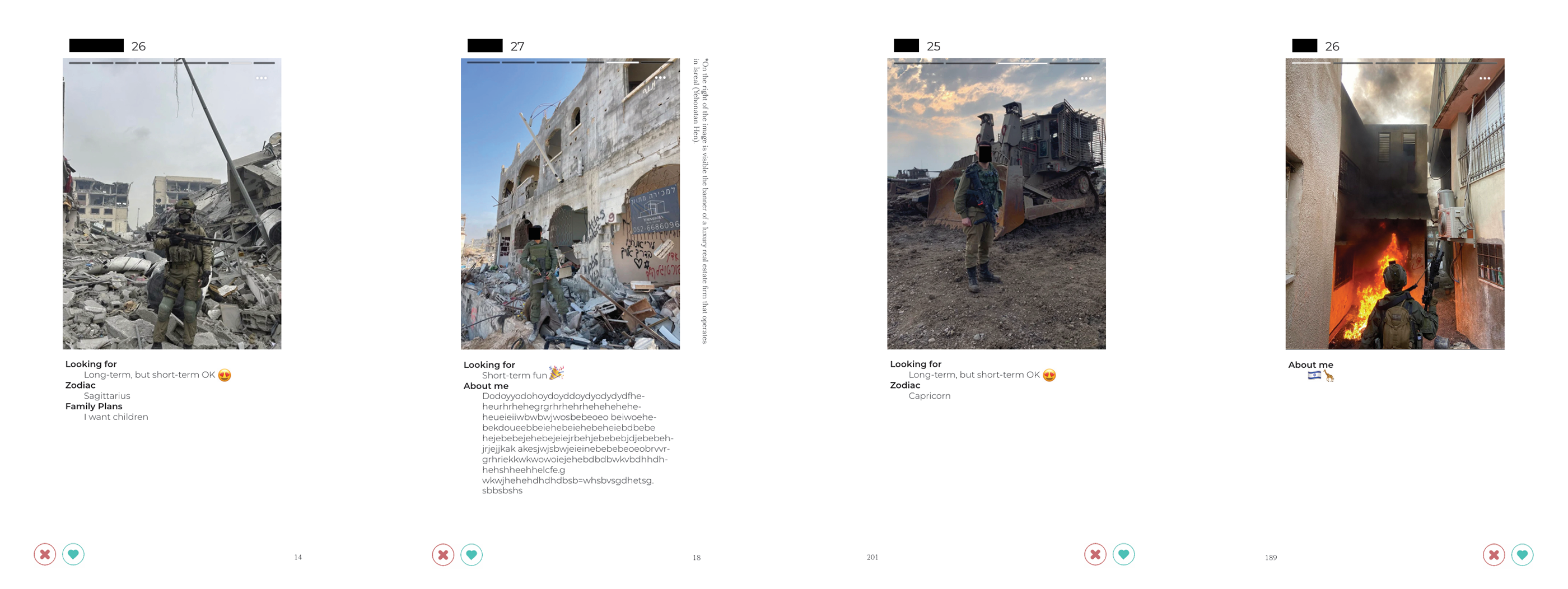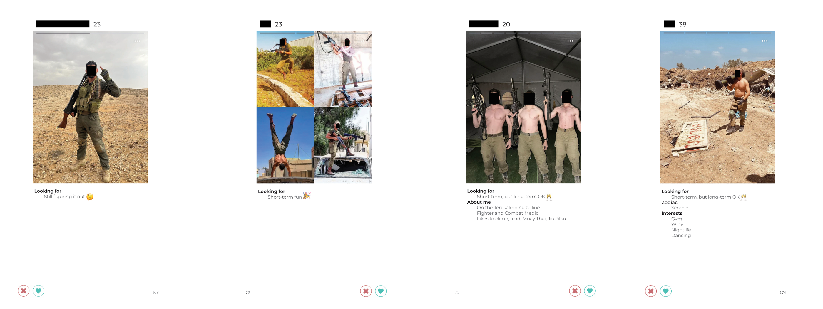 Long-term / Short term è un progetto sulla banalità del male: non il male come eccezione mostruosa ma come pratica ordinaria, inframezzata dai gesti quotidiani come i momenti ludici, di gioco infantile, nelle pause dalla guerra. In questo senso, lo scarto tra le immagini e le didascalie è sconcertante. Le brevi note che accompagnano i profili esplicitano sogni, ambizioni, progetti, gusti: si legge di un culto per le attività sportive, di un discrasico amore per gli animali, di pratiche osservanza religiosa (l’adesione alla dieta kosher, l’osservanza dello Shabbat), di cogenti desideri sessuali, di aspirazioni a stabilità, famiglia e relazioni “a lungo termine”. È in questa frizione che la militarizzazione della società israeliana – visibile anche nella centralità dell’esperienza di leva per entrambi i sessi e nella pervasività dell’istituzione e della propaganda militare e militarista – si manifesta nella sua forma più evidente: la violenza appare come valore incorporato nella società, compatibile con il linguaggio dell’intimità e implicitamente convertibile in attrattiva. Non si tratta soltanto di feticizzazione della violenza militarizzata – del kink verso l’uniforme; è piuttosto la violenza a farsi, nei codici della piattaforma, un tratto spendibile nella costruzione del “buon partner”: buon militare, buon patriota, buon amante, buon padre. La ricerca dell’amore in guerra e la guerra come garanzia di successo in amore. Più che Marte che cerca Venere, Eros che trova Thanatos.