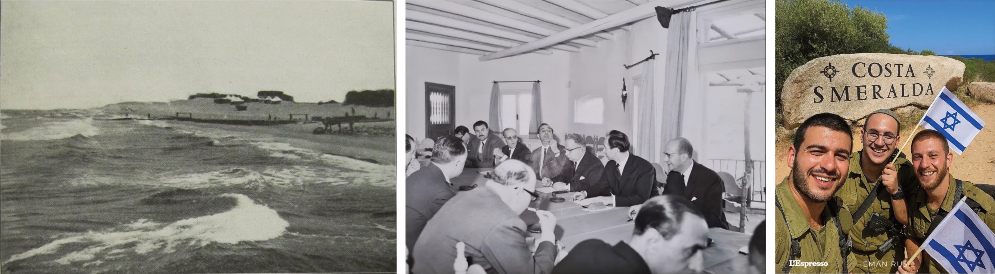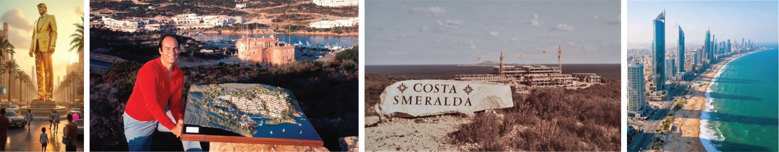 Nelle letture critiche che da decenni accompagnano il progetto della Costa Smeralda non emerge mai un’interpretazione univoca, e proprio l’oscillazione dei giudizi ci rivela la struttura e l’essenza profonda del progetto. Il marchio “Costa Smeralda” [Fig. 10] è uno scarto, puntuale e preciso, tra ordini di realtà, e segna la distanza fra il mondo (che era) reale e il mondo promesso. Nel ‘testo a fronte’ della riviera Trump-Gaza, colpiscono non tanto le statue d’oro che elevano Trump a divinità onnipotente, quanto la produzione di immagini che, fino a quel momento, nessuno aveva osato immaginare [Fig. 11]. In Sardegna, per un miracolo che ha a che fare con la dimensione fiabesca del potere della finanza e del capitale, l’Aga Khan individua un punto di fragilità culturale, di afasia autocertificativa, e riesce a spazzare via dalla realtà viva di quella terra e dei suoi abitanti la realtà precedente, sovrimponendo i suoi segni e i suoi simboli [Figg. 12-13]. E lo fa in un batter d’occhio, con l’efficacia performativa di un colpo di bacchetta magica turbocapitalista. Lo iato tra la fisicità del territorio e l’“exclusive paradise” immaginato è recuperabile soltanto mediante un, difficile, esercizio di rammemorazione. Il marchio “Costa Smeralda”, di vacuo ma efficace suono commerciale, apposto sulla toponomastica e sulla realtà storica e culturale precedente, non neutralizza la contraddizione, non risolve il problema dell’origine: si presenta come cifra di una tensione che, per ora, è ancora latentemente viva. Si è trattato di una vera rifondazione simbolica, non apertamente feroce e cruenta, ma radicale: in questo, la Costa e il suo potentissimo esercizio immaginativo, la sua utopia univoca e degenerata, è la stessa che ritroviamo con tutt’altra violenza sanguinaria nella figura discorsiva di Trump-Gaza.