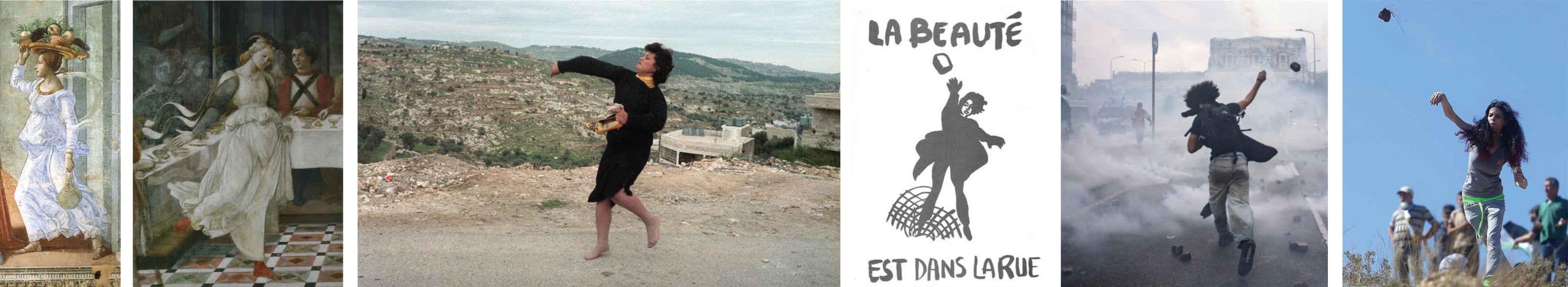 Lo abbiamo visto nelle manifestazioni del ’68: lo rivediamo ora nelle manifestazioni proPal [Figg. 3-4-5-6]. Il passo della Ninfa è decisivo. Non è sincrono: la Ninfa non marcia in falange, non sfila in parata, non obbedisce a un ordine pilotato. È un passo discronico, il suo, che eccede in contrappunto il ritmo del corteo: accelera, devia, si stacca, avanza di lato. È questo passo disallineato a generare un elemento produttivo di disturbo, a innescare un movimento che prima non c’era. La postura della Ninfa invoca – ed evoca con aggraziata prepotenza – una tensione, uno stato di sbilanciamento permanente. La Ninfa non è mai eretta secondo l’asse verticale, stabile e centrato, del canone classico. Il suo corpo è inclinato, sbilanciato in avanti, indietro o di lato. È un corpo che sta per fare qualcosa: correre, scattare, colpire, gridare [Figg. 3-6]. Grazie allo sguardo acuto di Warburg riusciamo a scorgere un corpo attraversato da una forza che lo disloca dall’equilibrio schematico e che si propone come un’antica e insieme nuovissima, iconografia. Il busto precede le gambe, il gesto anticipa l’azione. Non occupa lo spazio: lo fende. È una postura di urgenza: anche quando la Ninfa è ferma, il corpo sembra già in movimento. Non c’è simmetria né frontalità.