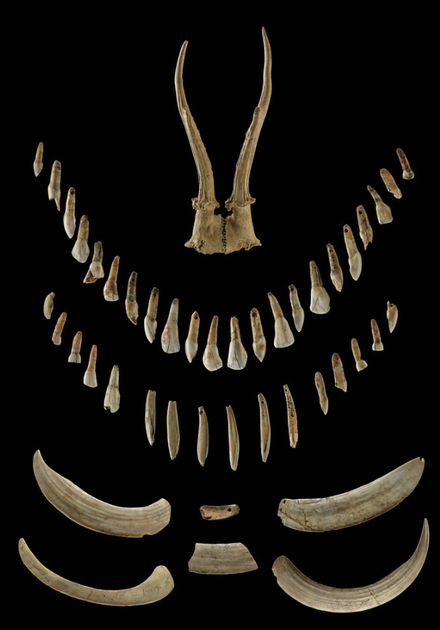 Sulla testa la defunta portava un copricapo costituito da corna e ossa di capriolo nonché denti animali [Fig. 1], mentre altri elementi erano riposti sul corpo della donna e in origine erano forse attaccati al pellame che ne copriva alcune parti. La sontuosità del capricapo e degli altri oggetti indicano il rango elevatissimo occupato dalla donna all’interno del clan: e ciò viene confermato dal corredo che le era stato dedicato, composto da 69 gioielli e 52 utensili. Corna di capriolo, zanne di cinghiale, lame di pietra, conchiglie, denti di animali, un osso di gru contenente 31 piccoli strumenti in selce, un’ascia forata posta sotto il braccio destro e frammenti di gusci di tre testuggini di palude, il cui utilizzo, come vedremo, poteva essere stato quello di contenitori per sostanze particolari.