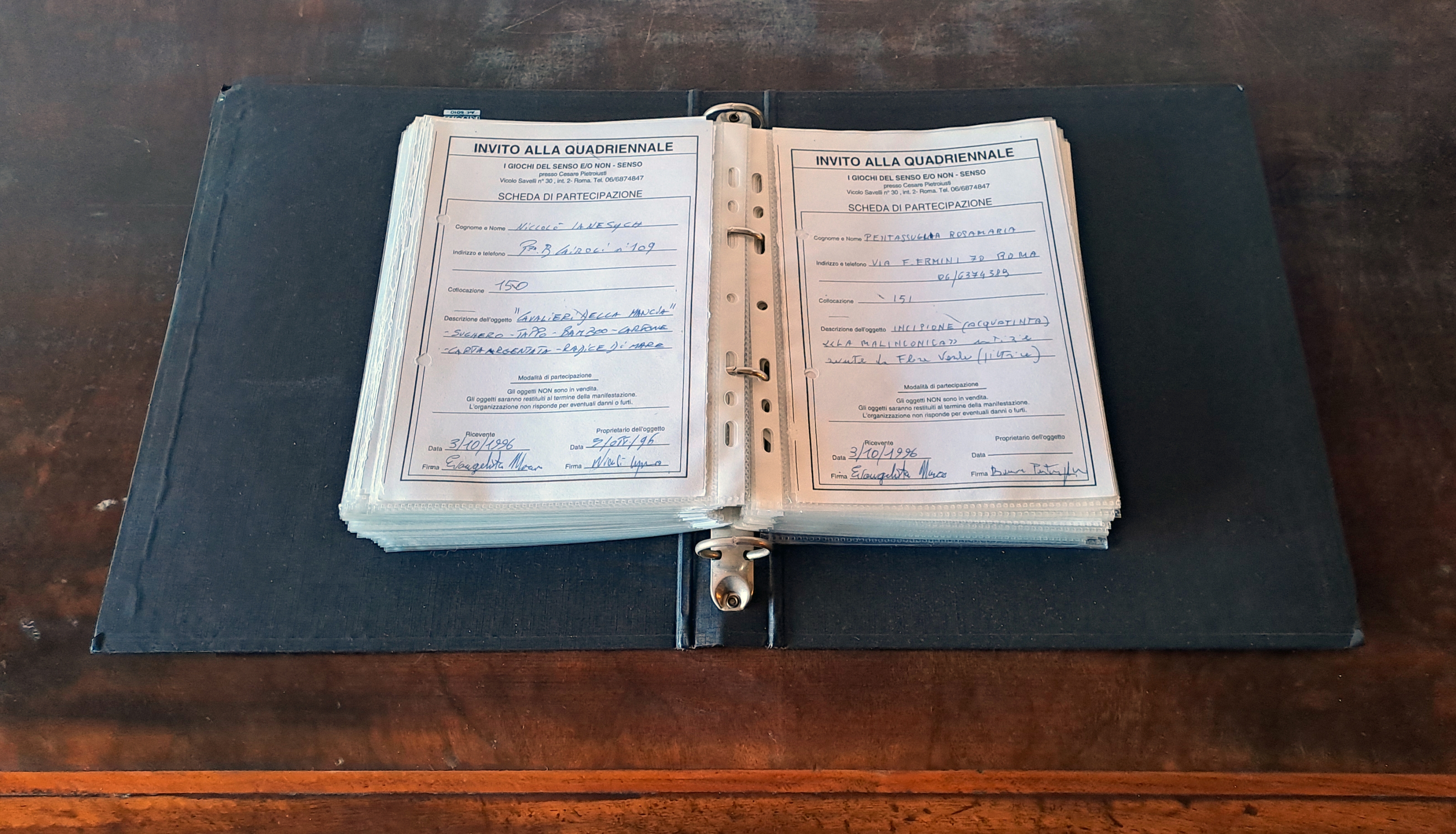 Fra agosto e settembre il mio studio di Vicolo Savelli si trasformò in base operativa (per l’occasione, e per poter ricevere messaggi nella segreteria, installai la linea telefonica, che ancora non avevo), e si riempì di centinaia di oggetti di ogni genere. Ogni proponente ricevette una “scheda di partecipazione”, numerata e controfirmata, con una breve descrizione dell’oggetto da esporre e il titolo (quando c’era). Le schede sono ancora tutte presso il mio archivio, in un grande raccoglitore nero. In questo momento, in cui sto scrivendo questo testo, le prendo in mano dopo molti anni e le conto. In totale sono 263.
