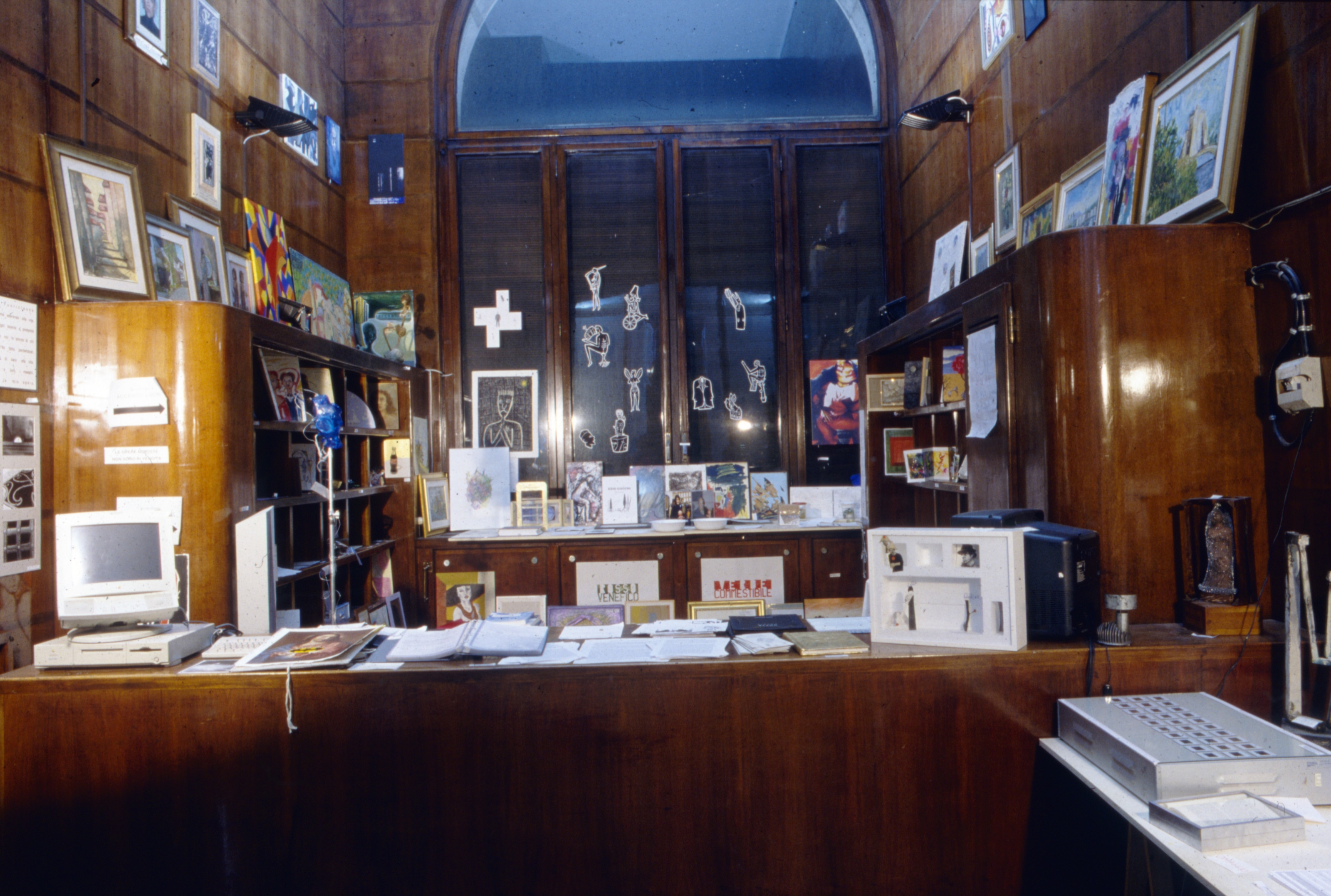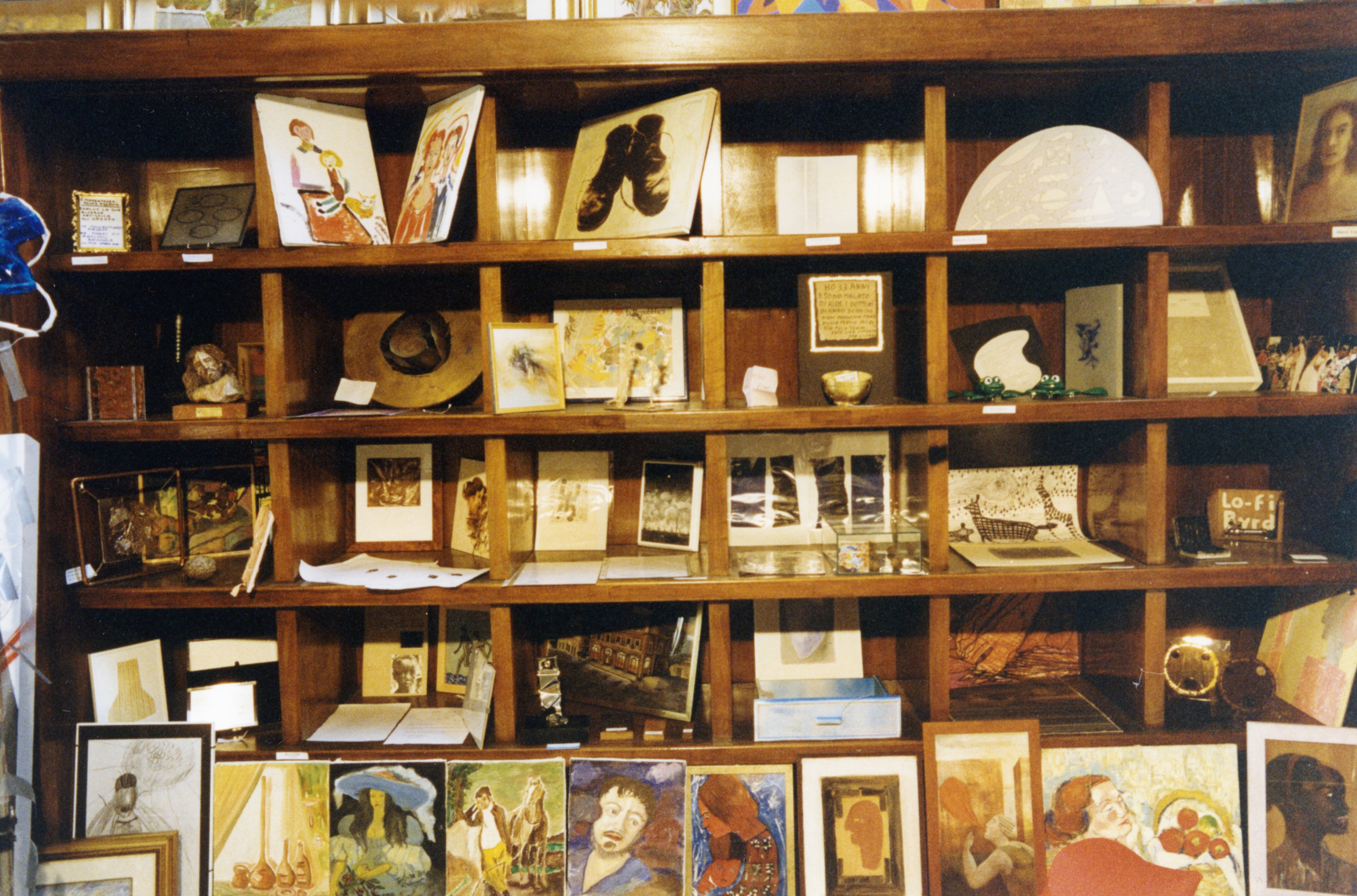 A ventiquattr’ore dall’inaugurazione arrivammo, di sera tardi, nella sede espositiva con tre o quattro automobili cariche di opere e, grazie a quanto detto sopra, riuscimmo a occupare senza sforzo lo spazio previsto per l’editore del catalogo e a trovare un posto per ognuno degli oggetti che ci erano stati consegnati. La sala era perfetta, con una bella boiserie a scansie quadrate molto adatte a ospitare piccoli oggetti, e con una notevole altezza delle pareti, e i quadri più grandi finirono lassù, per rispettare il principio per cui ogni pezzo esposto avesse simile visibilità.