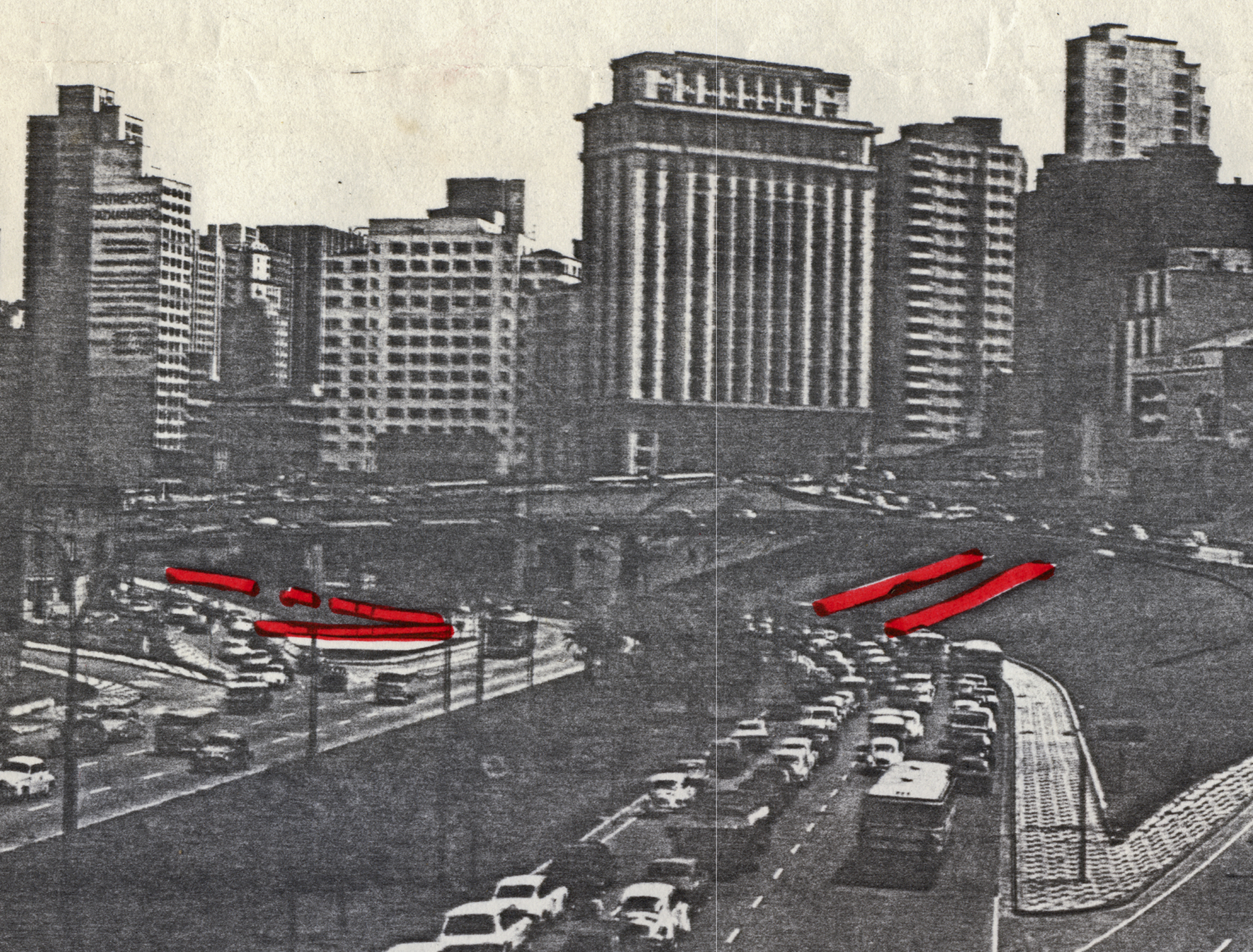 Interversão VI, the first action to bear this name, took place on the night of June 15, 1980. Without any form of authorization, the collective deployed a massive roll of red plastic – one hundred meters long, four meters wide – to draw a line across the two large oval cavities (buracos) that connect – at least visually and aerially – Avenida Paulista with Avenida Consolação. In the volume documenting the group’s activities, Ramiro notes that the site was selected because of its relation to the Nova Paulista project: a set of urban redevelopment plans initiated in the 1970s for Avenida Paulista and its system of infrastructural links, including underpasses, pedestrian crossings, and subterranean circulation flows (Ramiro 2017, 74).