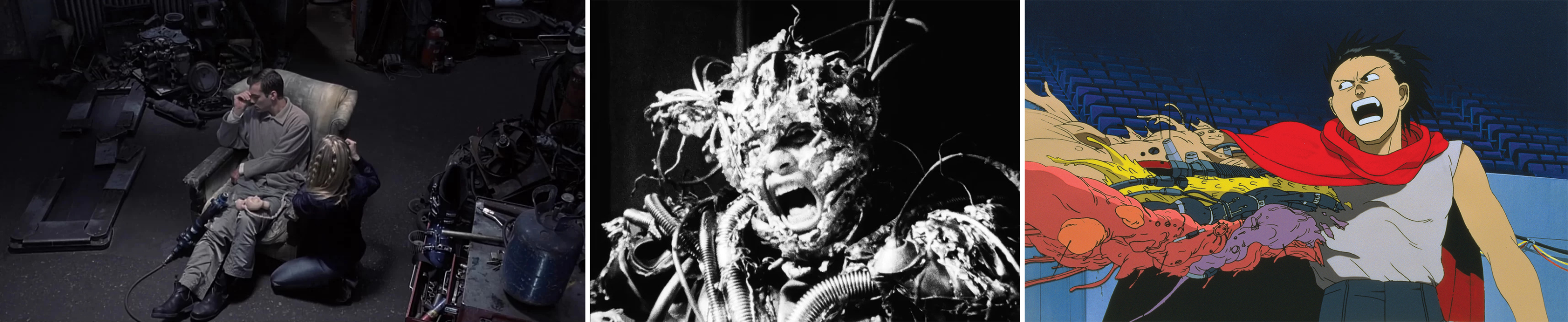 L’orizzonte visuale degli anni ’90 ha trovato la sua espressione più autentica nel Novo-Carnismo, una corrente estetica che rigetta la pulizia gnostica e binaria di apparati cinematografici quali Matrix a favore di una visione tellurica e secreziva della tecnica. Non si tratta di contrapporre due estetiche come gusti, ma di registrare un mutamento percettivo: dove prima il dispositivo prometteva distanza e trasparenza, qui impone opacità, contatto, umidità – cioè una prossimità che non consola. In opere come eXistenZ di David Cronenberg [Fig.14] (Alfano Miglietti 2004 e 2023; Bartolini 2012; Familiari 2004; Oneto 2002; Pagliardini 2021; Ponzini 2025; Ricci 2011), Tetsuo: The Iron Man di Shinya Tsukamoto [Fig.15] (Alfano Miglietti 2004 e 2023; Malagnini 2025; Oneto 2002) o l’apocalisse cinetica di Akira [Fig.16] (Andreetta 2025; Nacci 2018) la tecnologia si manifesta quale umidità organica e secrezione minerale. Non esiste il codice come astrazione immateriale; esiste solo il codice come infezione della carne. È in questa infezione che la tecnica smette di essere “tema” e diventa clima: non una questione su cui prendere posizione, ma una condizione dentro cui il corpo pensa, desidera e si altera. Il bio-pod cronenberghiano, composto di organi decomposti e innestato in orifizi biologici, costituisce la visualizzazione fenomenologica della macchina infetta: il cadavere di Dio che marcisce, producendo protesi che sono al contempo dispositivi di gioco e agenti di mutazione.