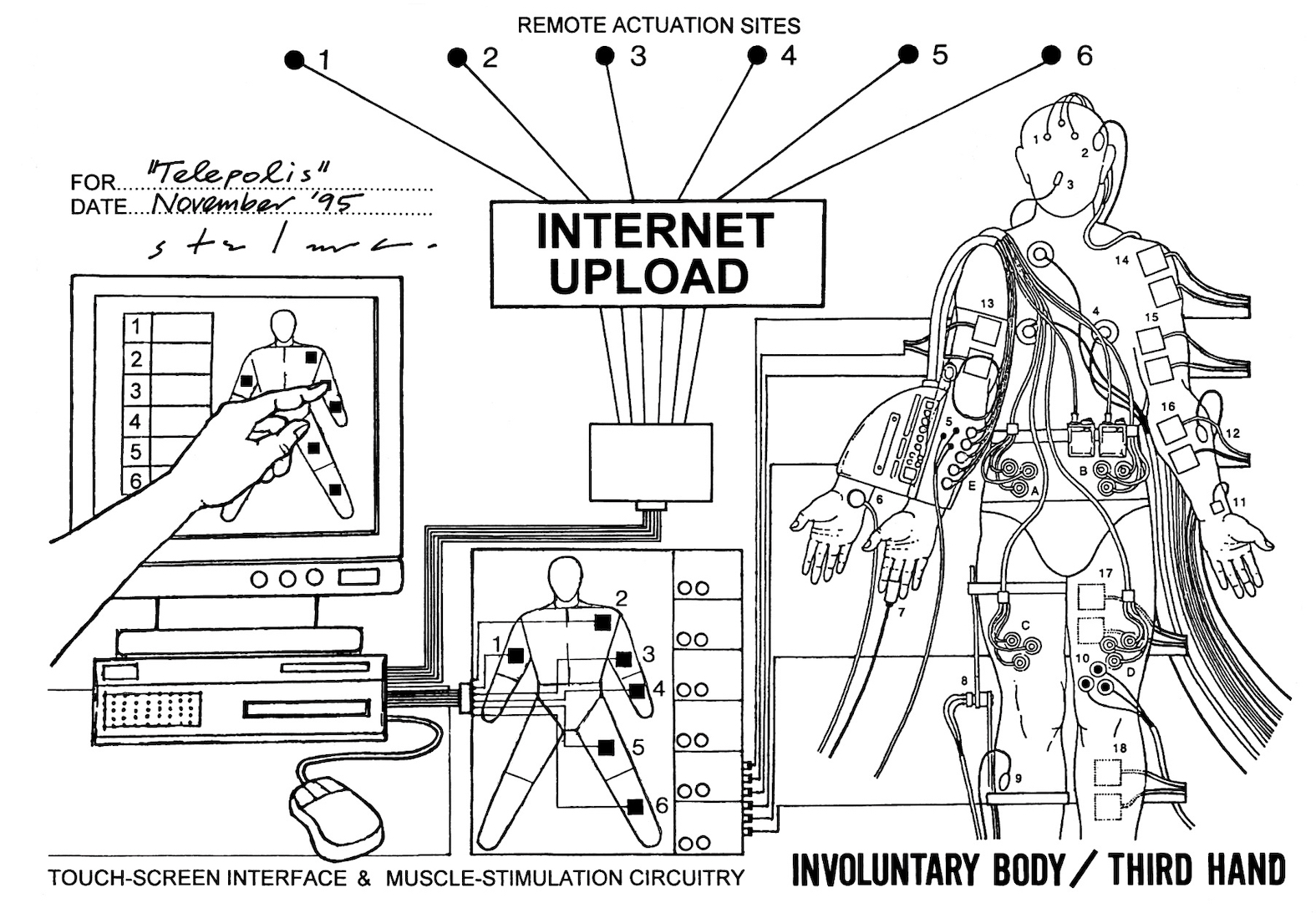 9 | Stelarc, Involuntary Body / Third hand (schema tecnico della performance svolta per Telepolis, 1995).