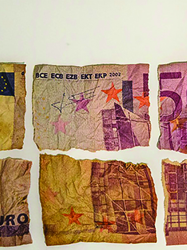 L’opera di Pietroiusti è composta da una banconota da cinquecento euro divisa in pezzi, i quali sono stati precedentemente mangiati, digeriti, espulsi, ripuliti ed esposti dall’autore e altre sei persone. Pietroiusti affronta direttamente uno dei nodi centrali del numero di questo numero di Engramma: le strategie possibili per restituire all’uso comune ciò che il capitale, diventato religione, ha separato trasformando anche i gesti più comuni in riti votati al guadagno.